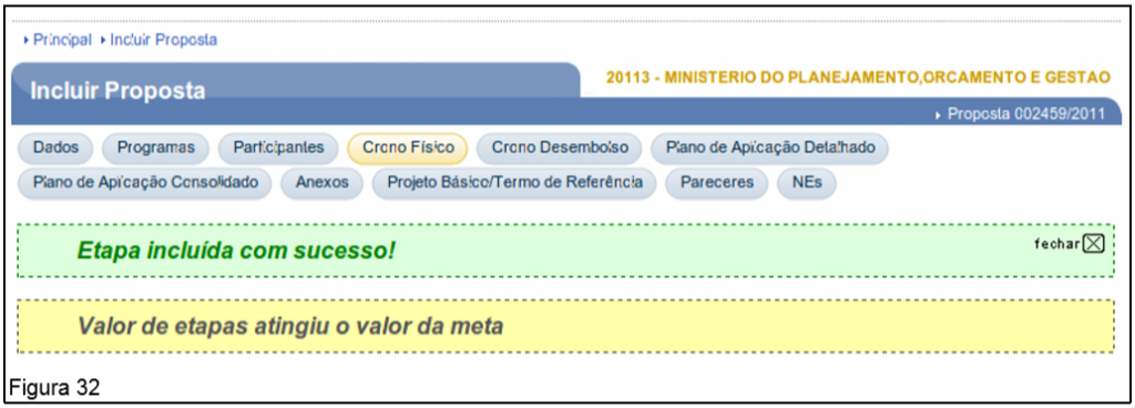 “Etapa incluída com sucesso” e quando a soma do valor das etapas atingir o valor da meta em questão. o sistema exibirá também a Mensagem: “Valor de etapas atingiu o valor da meta”, conforme Figura 32.
