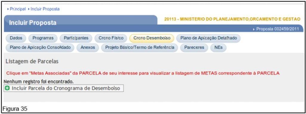Para incluir o Cronograma Desembolso, o usuário deverá clicar na aba “Crono Desembolso”. No exemplo, serão incluídas 02(duas) parcelas. O usuário deverá clicar no botão “Incluir Parcela do Cronograma de Desembolso”, conforme Figura 35.