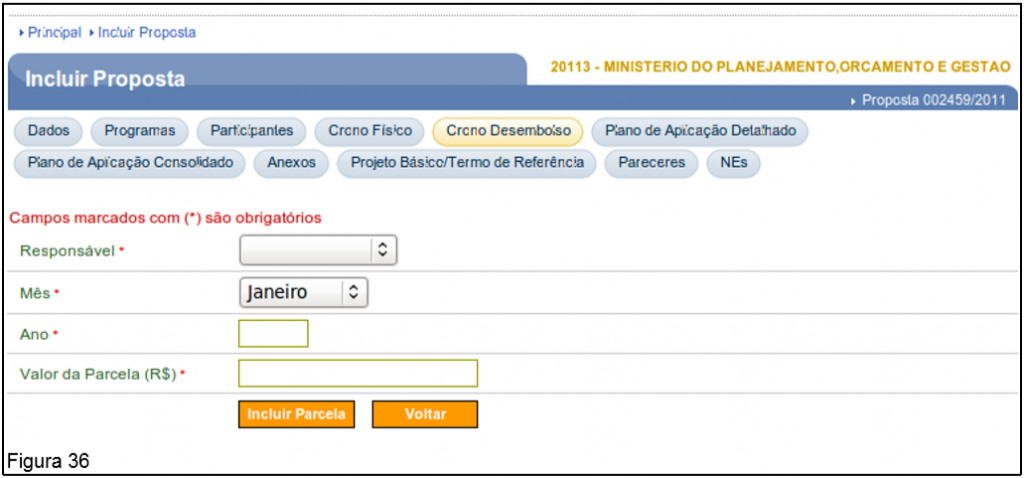 Responsável: deve ser selecionado o responsável pela liberação da parcela, sendo o Concedente e/ou Convenente, de acordo com o cronograma do Proponente;