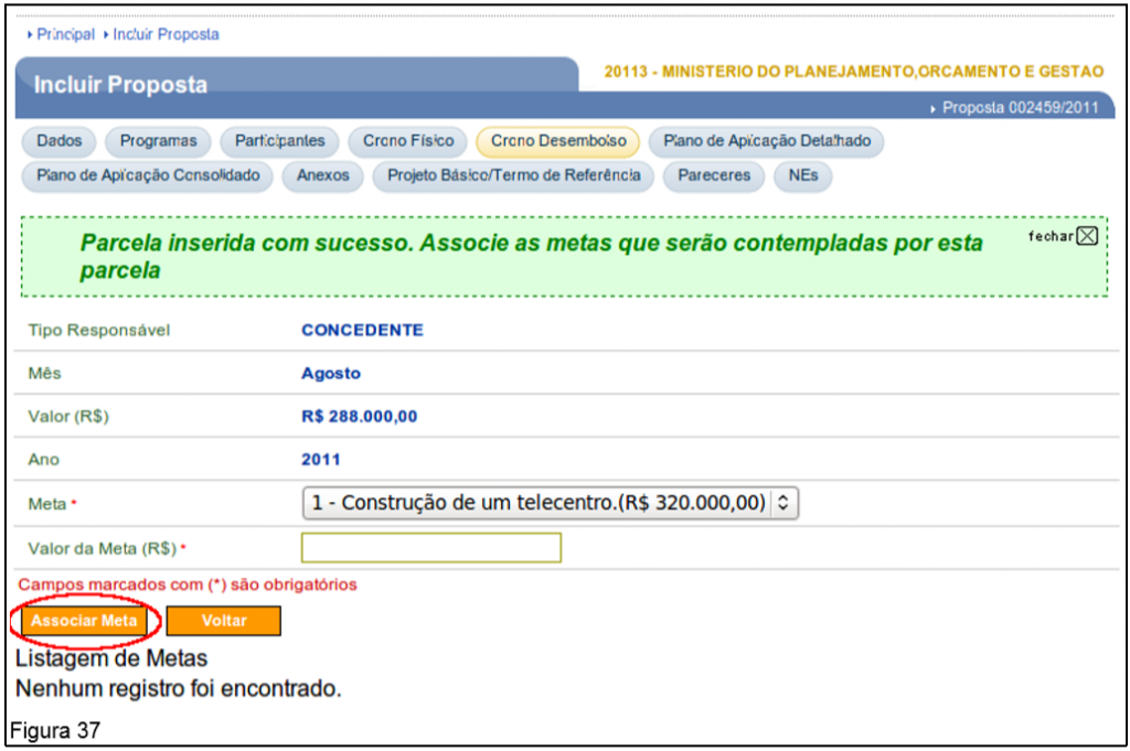 O sistema exibirá Mensagem “Parcela inserida com sucesso. Associe as metas que serão contempladas por esta parcela”.