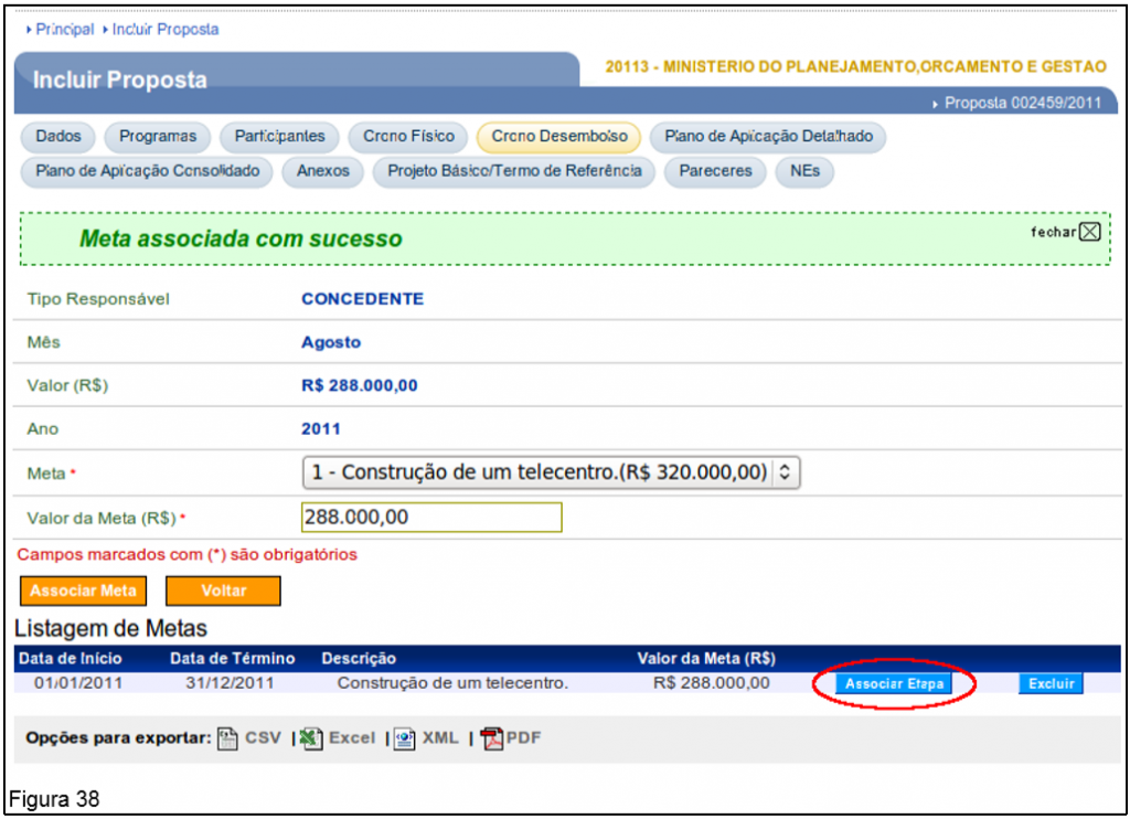 Após associar a parcela à meta, o usuário deverá também associar a parcela à etapa.
