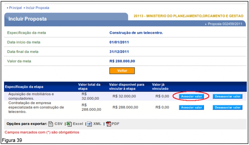 O sistema exibirá a tela com os dados da meta selecionada, as especificações da etapa e valor(es) disponível(is) para vincular à(s) etapa(s). O usuário deverá clicar no botão “Associar Valor”, conforme Figura 39.