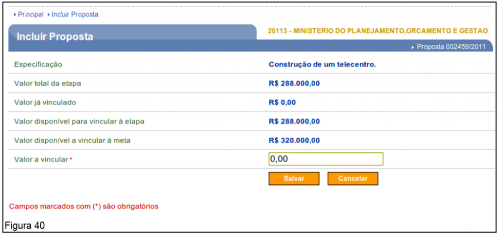 Após o usuário clicar no botão “Associar Valor”, o sistema exibirá tela com os dados da etapa e da meta e o campo “Valor à Vincular” a ser preenchido.