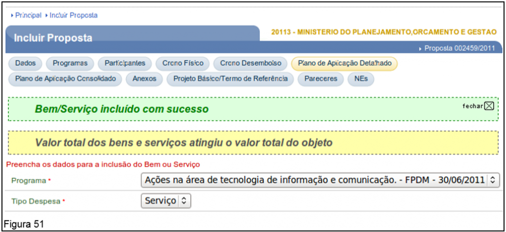 Após o preenchimento do último e de todos os itens, o sistema exibirá as mensagens: ”Bem/Serviço incluído com sucesso” e quando a soma do valor dos itens atingir o valor global do Convênio, o sistema exibirá também a Mensagem: “Valor total dos bens e serviços atingiu o valor total do Objeto”, conforme Figura 51.