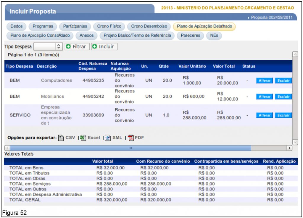 Na seção de Valores Totais, o sistema contabiliza e atualiza os valores informados para cada item incluído e observe que os itens incluídos poderão ser alterados ou excluídos, conforme Figura 52.