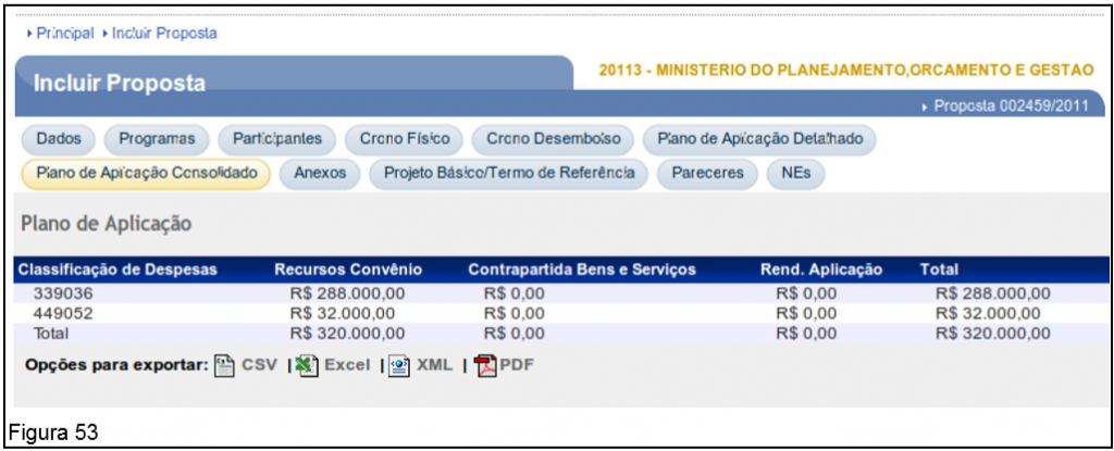 Informada a relação do(s) item(ns) de tipo de despesa, o sistema disponibilizará o Plano de Aplicação Consolidado dos recursos a serem desembolsados pelo Concedente e Convenente em forma de Contrapartida, se for o caso.