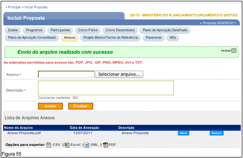 Uma proposta pode ter mais de um anexo. Os anexos incluídos são exibidos na parte inferior da tela. Para cada anexo, o sistema disponibiliza os botões de “Abrir” e “Excluir”, que permitem sua visualização ou exclusão, caso necessário, conforme Figura 55.