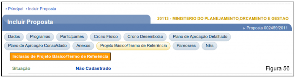 Para inclusão de Projeto Básico/Termo de Referência, o usuário deverá acessar a aba “Projeto Básico/Termo de Referência”. Podem ser incluídos documentos contendo por exemplo, os dados da obra (Projeto Básico), a contratação de serviços e aquisição de material (Termo de Referência). Para isto, o usuário deverá clicar em “Inclusão de Projeto Básico/Termo de Referência”, conforme Figura 56.