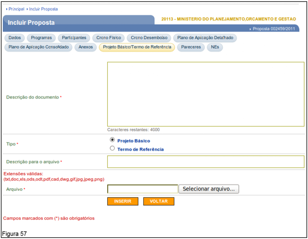 Após o usuário clicar no botão “Inclusão de Projeto Básico/Termo de Referência”, o sistema exibirá tela com os campos a serem preenchidos conforme orientações a seguir: