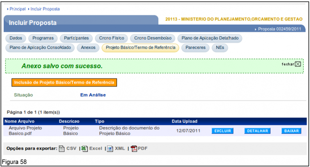 Uma proposta pode ter mais de um arquivo de Projeto básico/termo de referência. Os arquivos incluídos são exibidos na parte inferior da tela. Para cada arquivo, o sistema disponibiliza os botões de “Excluir”, “Detalhar” e “Baixar”, que permitem sua exclusão, detalhamento ou download, caso necessário, conforme Figura 58.