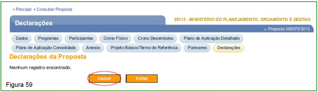 Para inclusão das declarações, o usuário deverá acessar a aba “Declarações” e clicar no botão “Incluir”, conforme Figura 59.