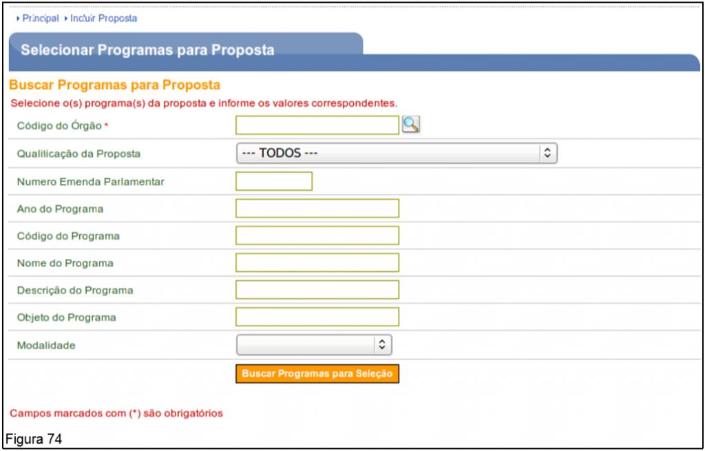 O sistema exibirá tela para a seleção do Programa. O usuário deverá preencher alguns dados para a consulta e clicar em “Buscar Programas para seleção”, conforme Figura 74.