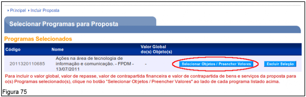 O usuário deverá clicar no botão “Selecionar Objetos/Preencher Valores”, conforme Figura 75.