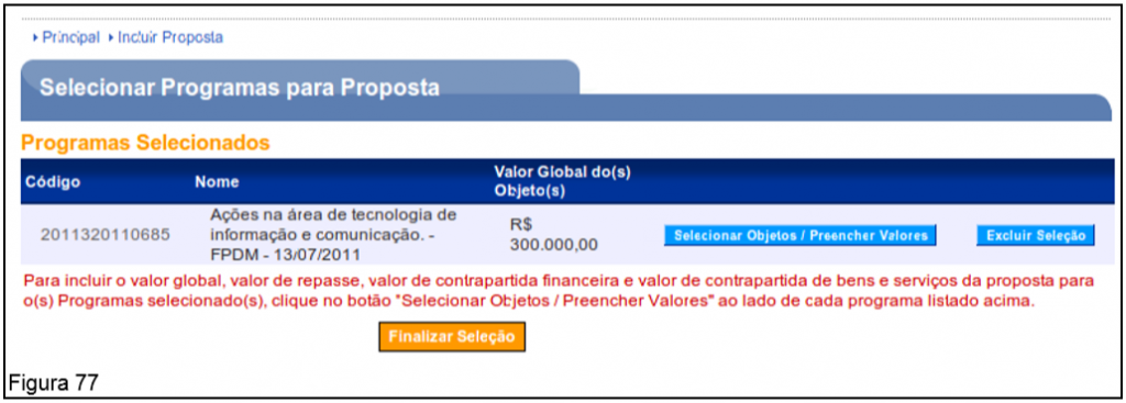O sistema exibirá tela, com o campo “Valor Global do(s) Objeto(s) (R$)” preenchido. O usuário deverá clicar no botão “Finalizar Seleção”, conforme Figura 77.
