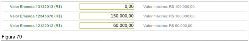 No exemplo, o recurso da Emenda 12122012 foi utilizado o valor máximo disponível. O recurso da Emenda 12345678 foi utilizado 150.000,00 do valor máximo disponível e a Emenda 13132013 não foi utilizado nenhum valor do recurso, conforme Figura 79.