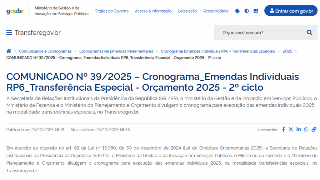 URL: https://www.gov.br/transferegov/pt-br/comunicados/comunicados-gerais/2025/comunicado-no-39-2025-2013-cronograma_emendas-individuais-rp6_transferencia-especial-orcamento-2025-2o-ciclo